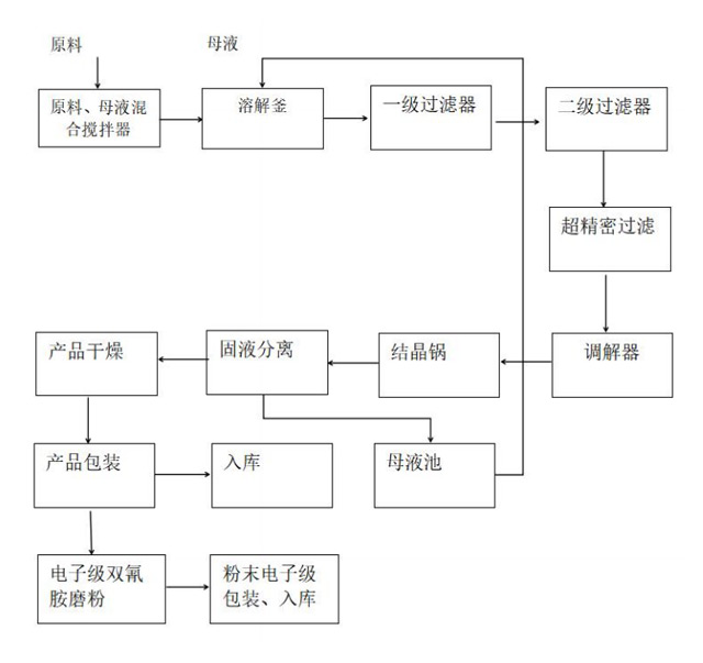将母液或软化水打入投料搅拌器,按照比例投入双氰胺,经泵打入溶解釜,升温充分溶解后,放入溶解液储罐后经泵打入一级过滤器,过滤液进入一级滤液储罐,再经泵打入二级过滤器,进行精密过滤,滤液经精密过滤器出口再经超精密过滤器打入结晶锅中结晶,冷却结晶后由结晶锅放出,经离心机进行固液分离,分离后的湿结晶体经螺旋机送入燥机干燥,干燥后的成品,称量、包装。